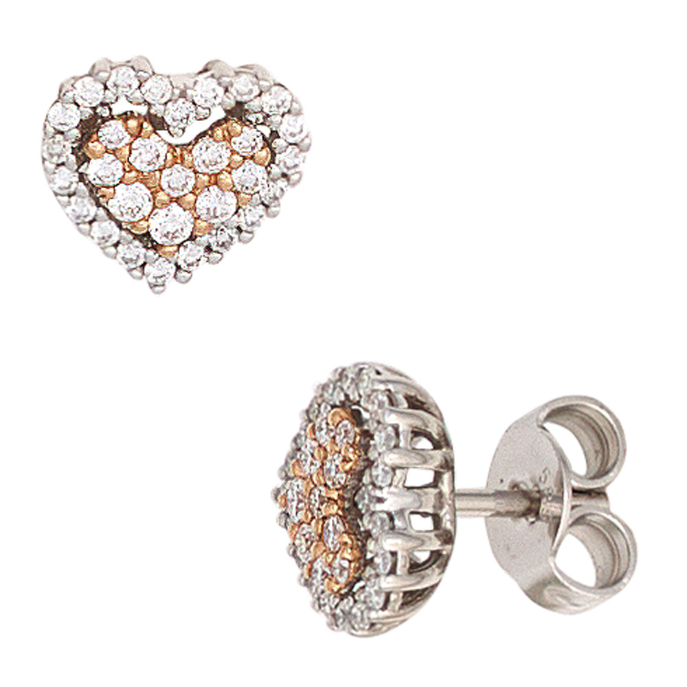 1 Paar Ohrstecker "Herz" aus 14 Karat (585) Gold, Weißgold mit Rotgold kombiniert, mit 60 Diamant-Brillanten, 0,30 ct., W/SI wesselton (weiß), SI=(kleine, mit bloßem Auge nicht erkennbare natürliche Einschlüsse), Feinbearbeitung gut, Höhe ca. 7,8 mm, Breite ca. 8,6 mm, Gewicht ca. 1,7 g * Bitte beachten Sie die Maße! Auf dem Foto kann der Artikel größer wirken *