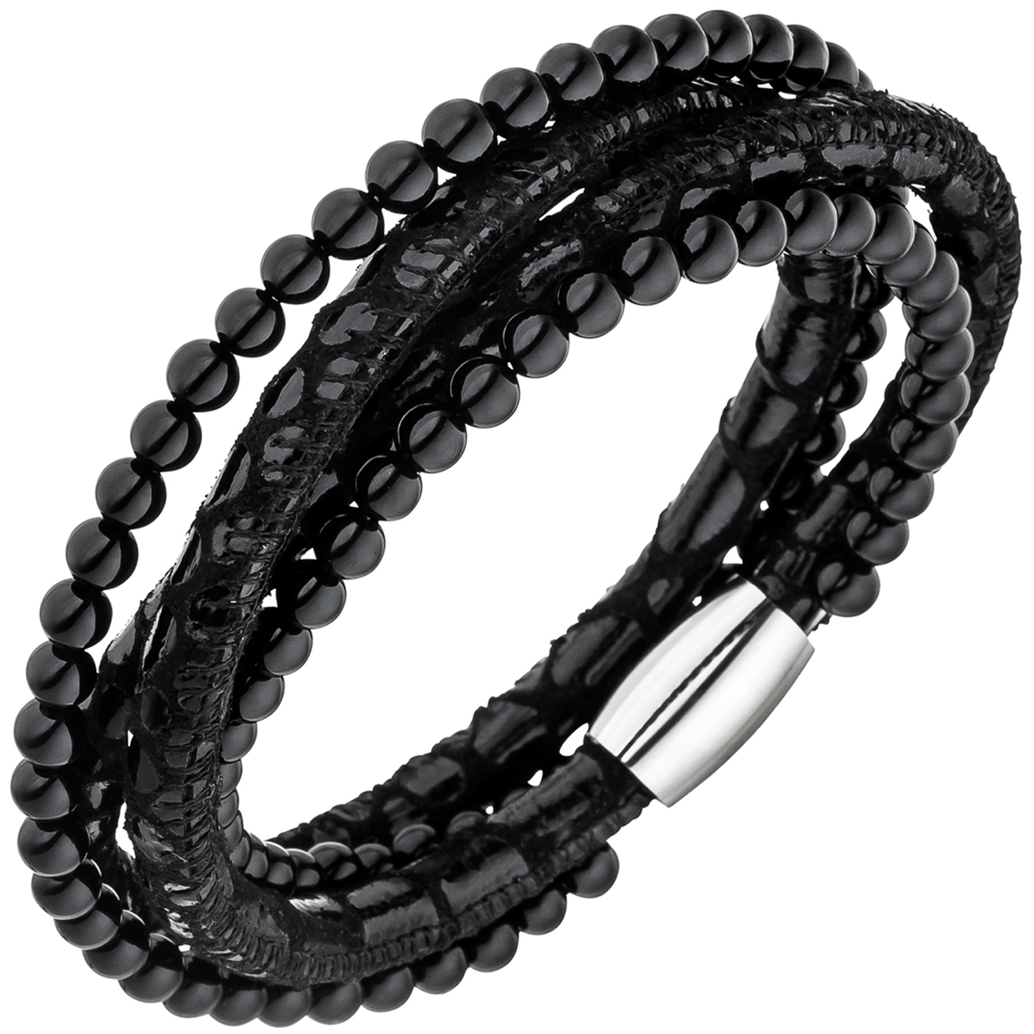 Armband aus schwarzem Print-Leder mit ca. 89 Onyx-Kugeln kombiniert, 2-fach gewickelt ca. 19 cm lang, mit Magnetverschluss aus Edelstahl, Stärke ca. 18,7 mm x 4,6 mm, Gewicht ca. 18,4 g * Bitte beachten Sie die Maße! Auf dem Foto kann der Artikel größer wirken *