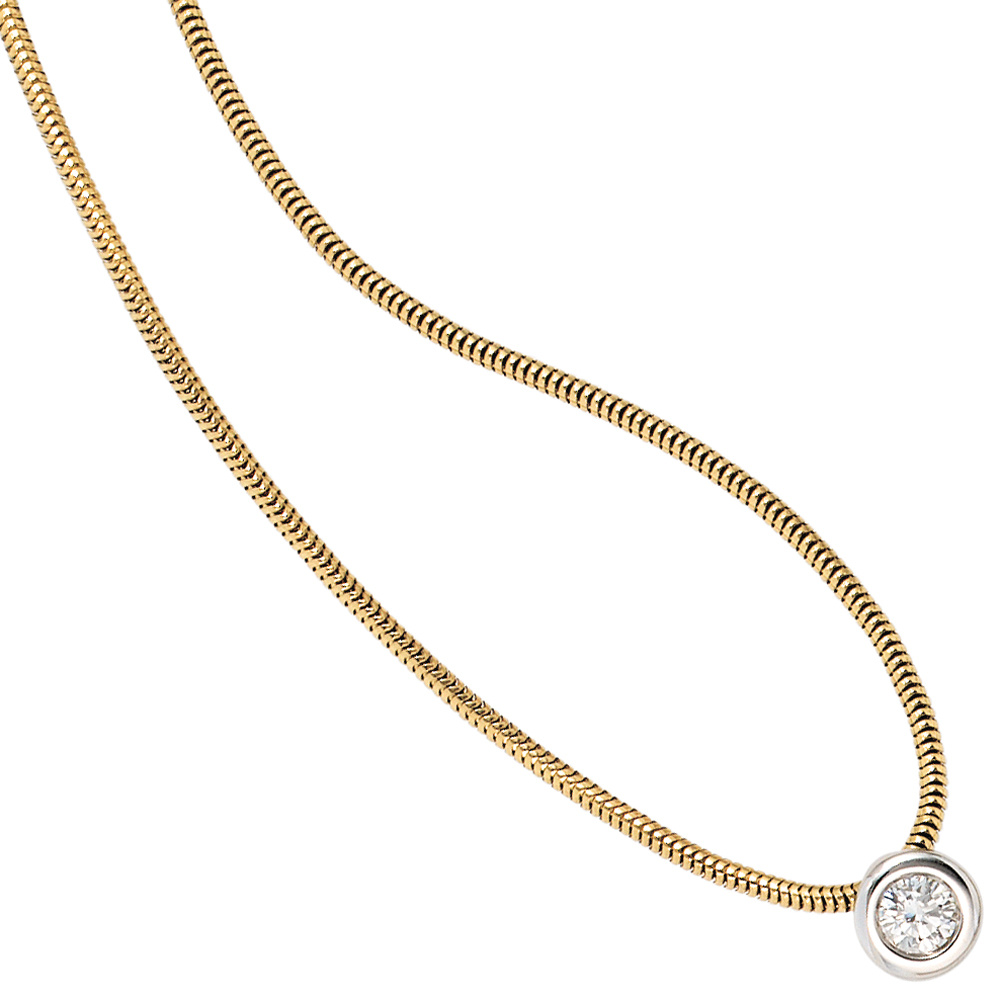 Collier aus 14 Karat (585) Gold, Gelbgold mit Weißgold kombiniert, mit einem Diamant-Brillanten, 0,25 ct., W/SI wesselton (weiß), SI=(kleine, mit bloßem Auge nicht erkennbare natürliche Einschlüsse), Feinbearbeitung gut, mit Karabinerverschluss, Länge ca. 42 cm, Durchmesser ca. 6,6 mm, Kettenstärke ca. 1,4 mm x 1,4 mm, Tiefe ca. 4,2 mm, Gewicht ca. 5,2 g * Bitte beachten Sie die Maße! Auf dem Foto kann der Artikel größer wirken *