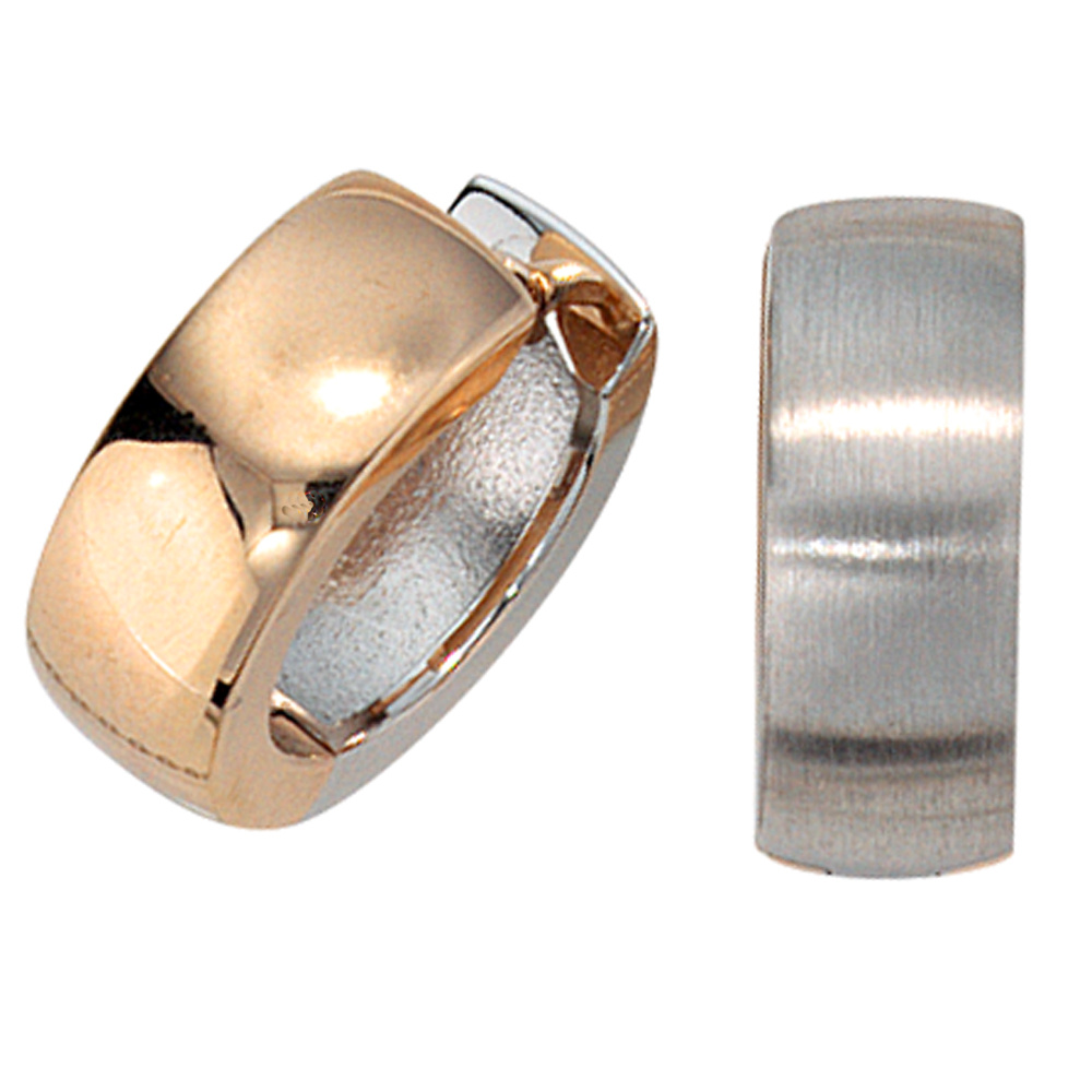 1 Paar Creolen mit Klappmechanik aus 14 Karat (585) Gold, Weißgold mit Rotgold kombiniert, teilmattiert, Außendurchmesser ca. 13,7 mm, Breite ca. 5,1 mm, Gewicht ca. 4,0 g * Bitte beachten Sie die Maße! Auf dem Foto kann der Artikel größer wirken *