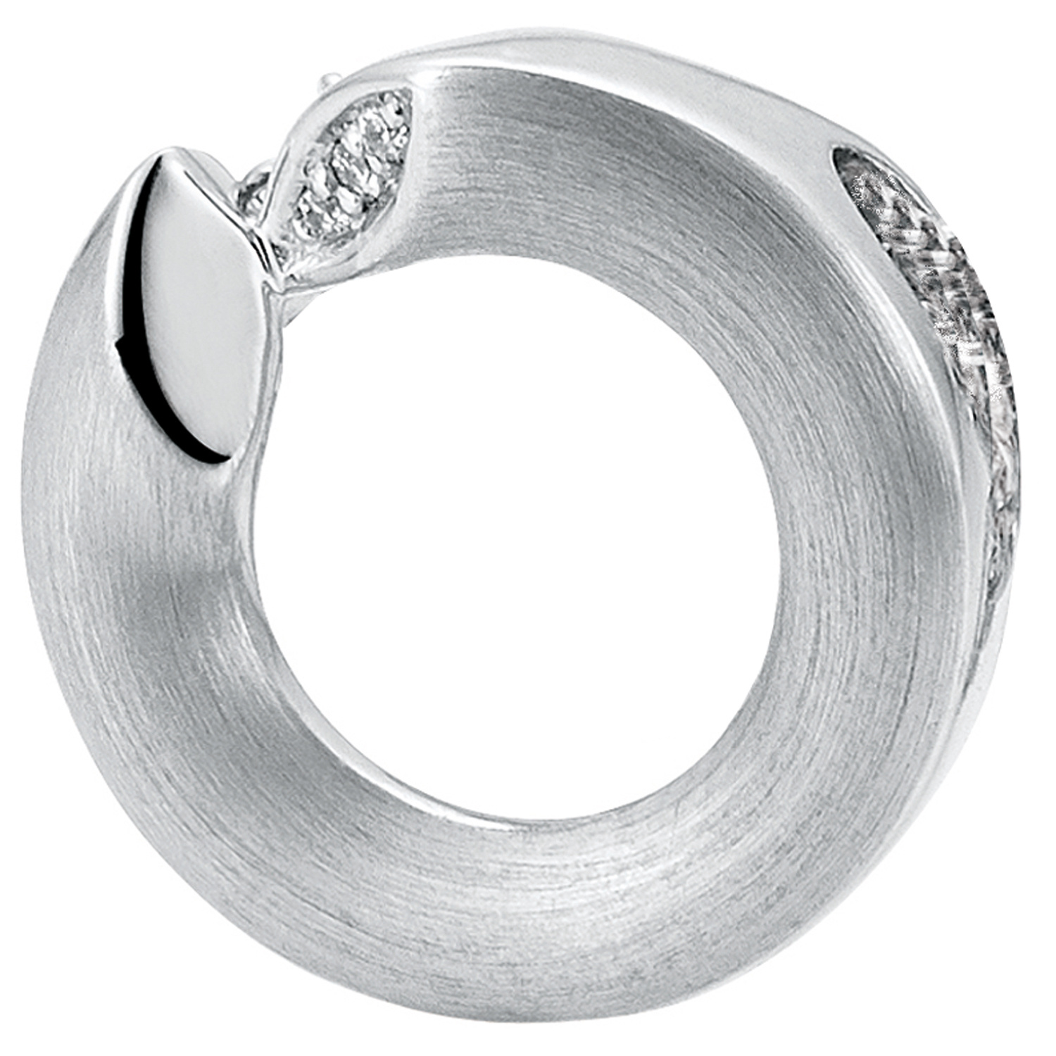 Anhänger aus 14 Karat (585) Weißgold, teilmattiert, mit 3 Diamant-Brillanten, 0,019 ct., W/SI wesselton (weiß), SI=(kleine, mit bloßem Auge nicht erkennbare natürliche Einschlüsse), Feinbearbeitung gut, Durchmesser ca. 16,6 mm, Tiefe ca. 7,1 mm, Innenmaße der Öse ca. 4,6 mm x 3,1 mm, Gewicht ca. 2,6 g * Bitte beachten Sie die Maße! Auf dem Foto kann der Artikel größer wirken *