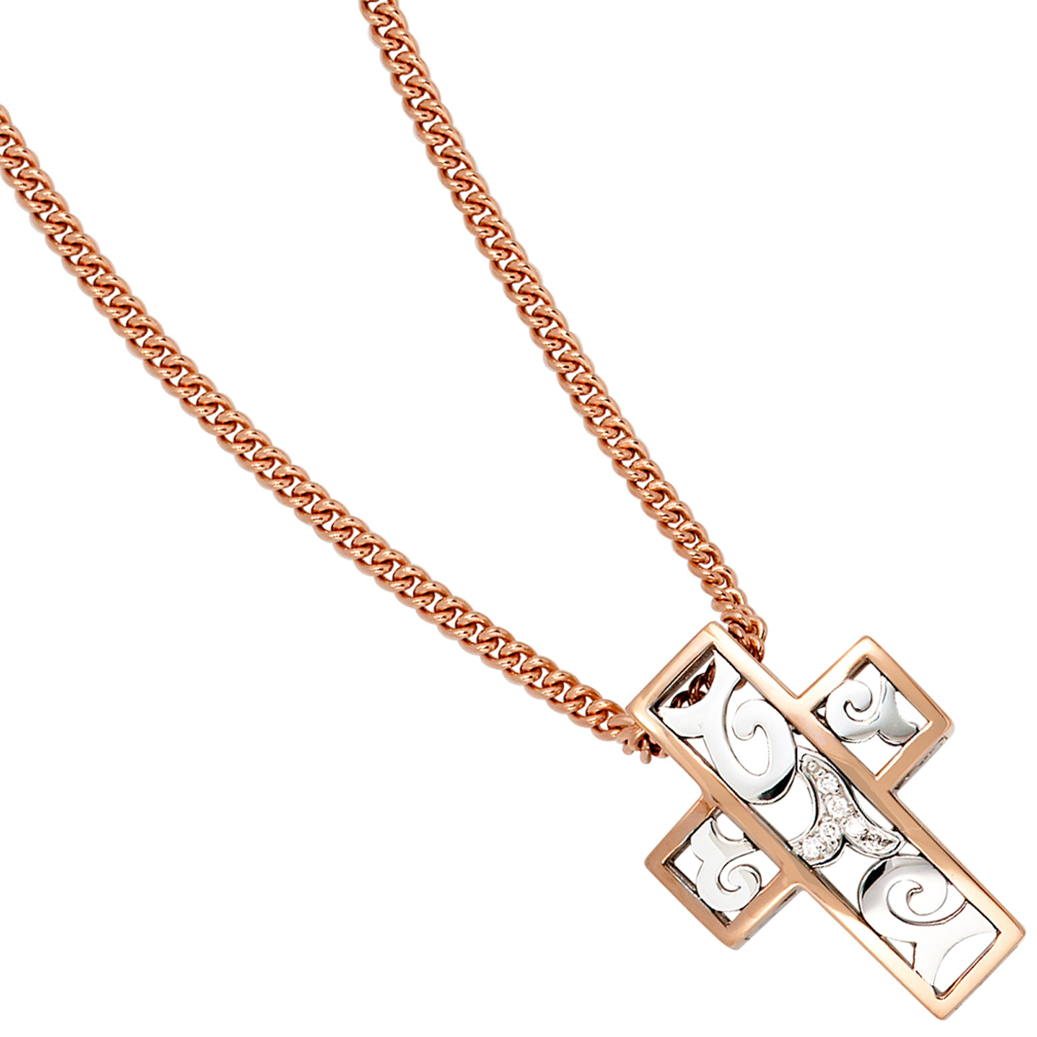 Anhänger "Kreuz" ohne Kette aus 14 Karat (585) Gold, Weißgold mit Rotgold kombiniert, mit 6 Diamant-Brillanten, 0,033 ct., W/SI wesselton (weiß), SI=(kleine, mit bloßem Auge nicht erkennbare natürliche Einschlüsse), Feinbearbeitung gut, Höhe ca. 23,1 mm, Breite ca. 16,8 mm, Tiefe ca. 6,1 mm, Innenmaße der Öse ca. 4,7 mm x 2,8 mm, Gewicht ca. 4,7 g * Bitte beachten Sie die Maße! Auf dem Foto kann der Artikel größer wirken *