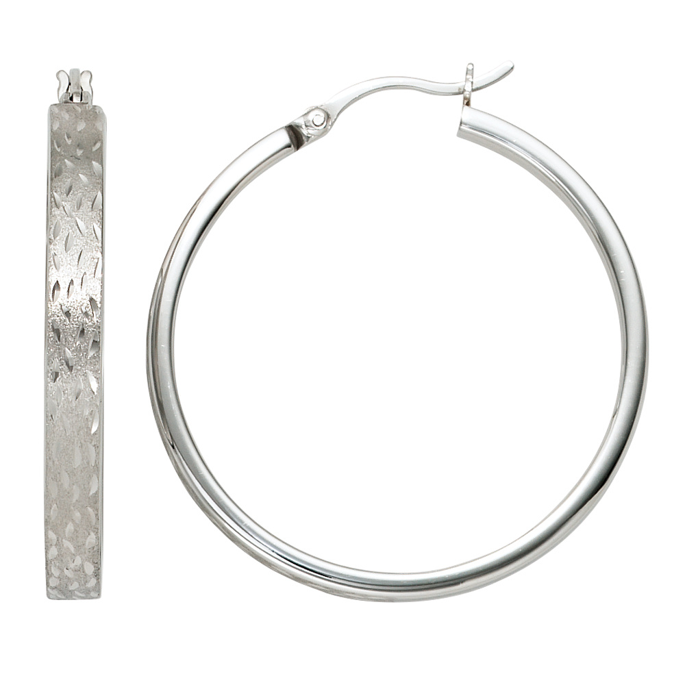 1 Paar Creolen aus 925 Sterlingsilber, rhodiniert und teilmattiert, Außendurchmesser ca. 34,4 mm, Breite ca. 4,1 mm, Gewicht ca. 5,2 g * Der Artikel ist anlaufgeschützt (rhodiniert) * Bitte beachten Sie die Maße! Auf dem Foto kann der Artikel größer wirken *