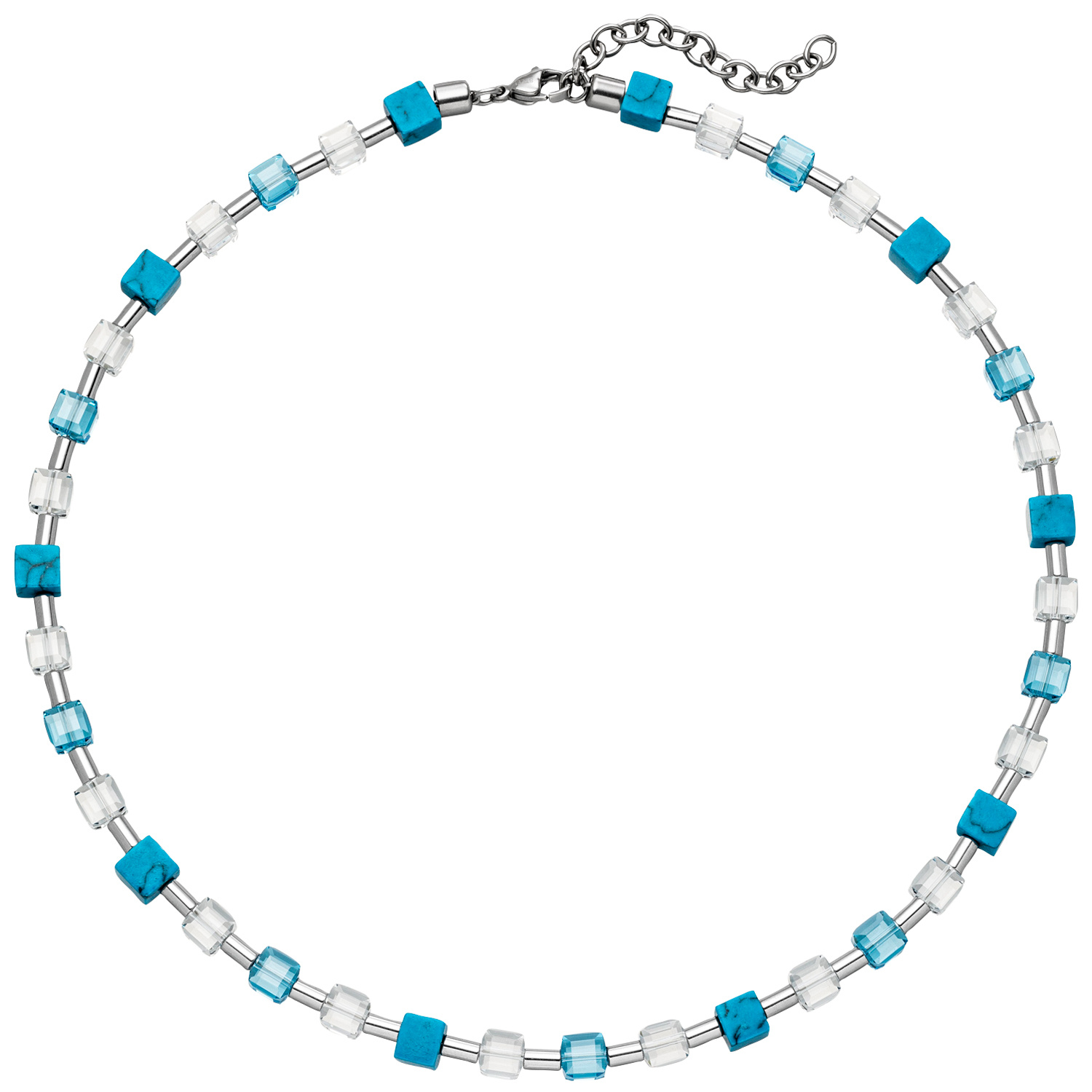 Halskette mit Kristallsteinen Türkis-Würfeln und Edelstahl 48 cm