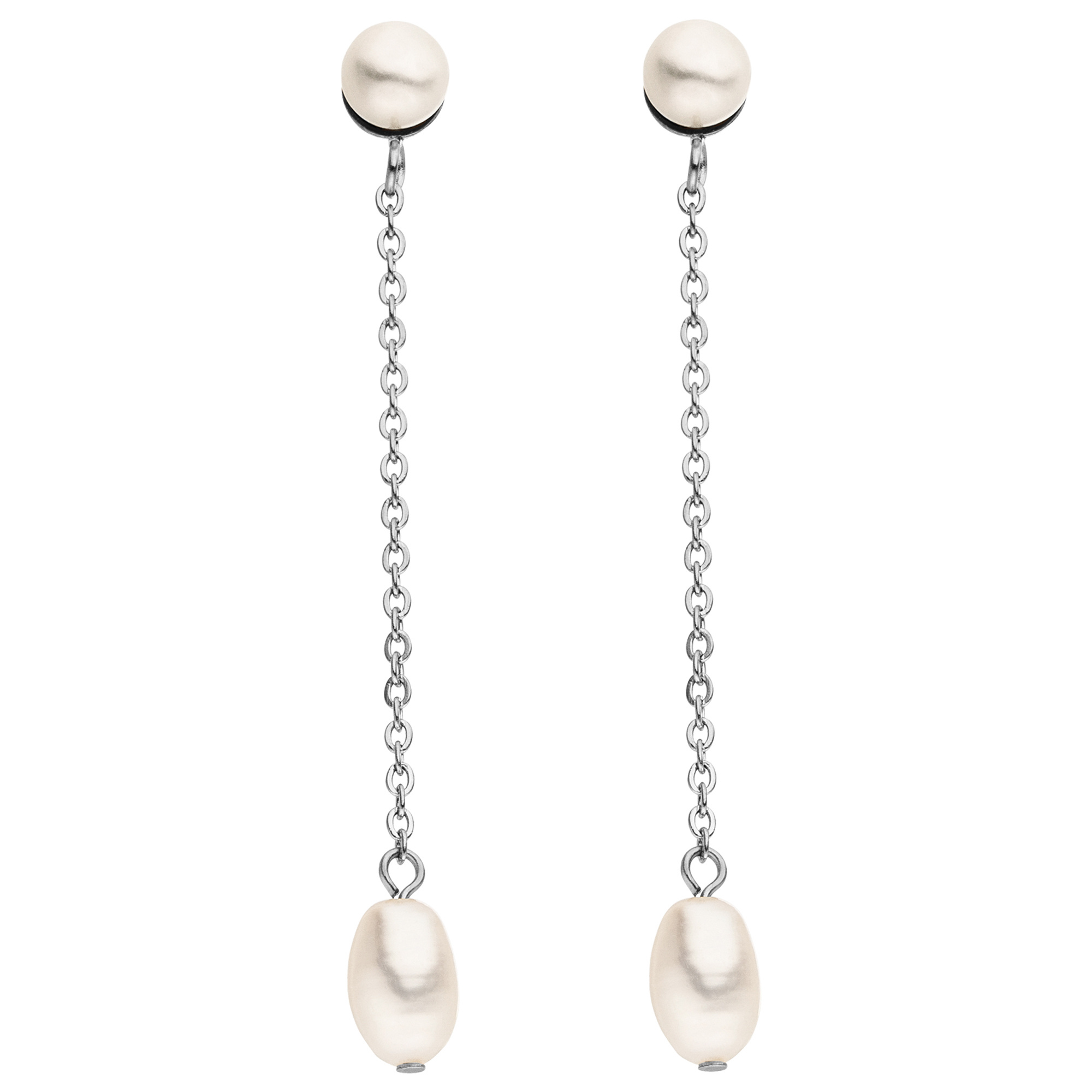 1 Paar Ohrhänger aus Edelstahl mit 4 Süßwasser-Zuchtperlen, Höhe ca. 60 mm, Breite ca. 6,2 mm, Gewicht ca. 2,1 g * Bitte beachten Sie die Maße! Auf dem Foto kann der Artikel größer wirken *