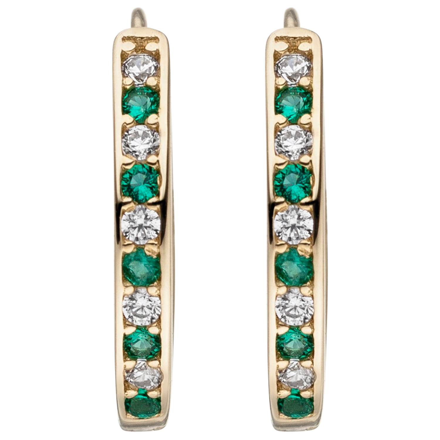 1 Paar ovale Creolen mit Klappmechanik aus 8 Karat (333) Gelbgold, mit 10 weißen Zirkonia und 10 grünen Zirkonia, Höhe ca. 12,2 mm, Breite ca. 1,6 mm, Gewicht ca. 0,9 g * Bitte beachten Sie die Maße! Auf dem Foto kann der Artikel größer wirken *