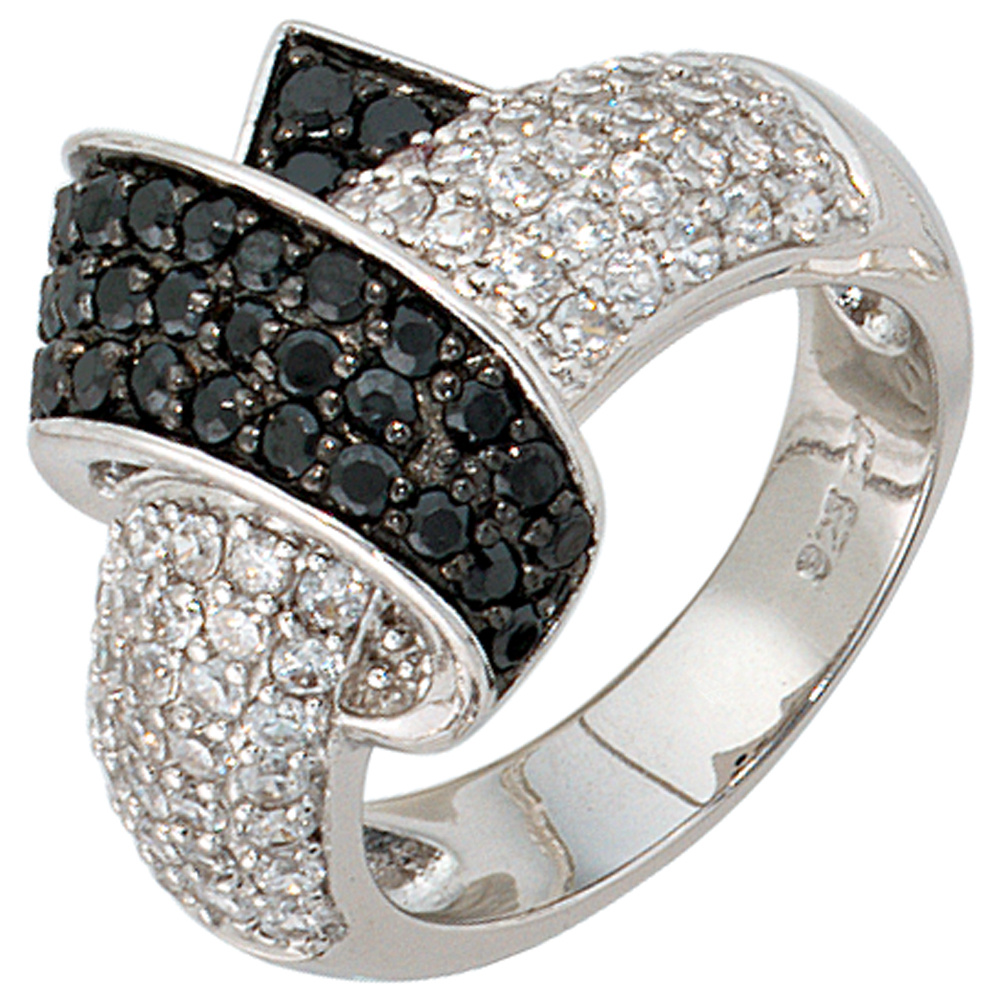 Damenring aus 925 Sterlingsilber, rhodiniert, mit 34 schwarzen und 60 weißen Zirkonia, Breite ca. 16,5 mm, Tiefe ca. 8 mm, Gewicht ca. 8,1 g * Der Artikel ist anlaufgeschützt (rhodiniert) * Bitte beachten Sie die Maße! Auf dem Foto kann der Artikel größer wirken *