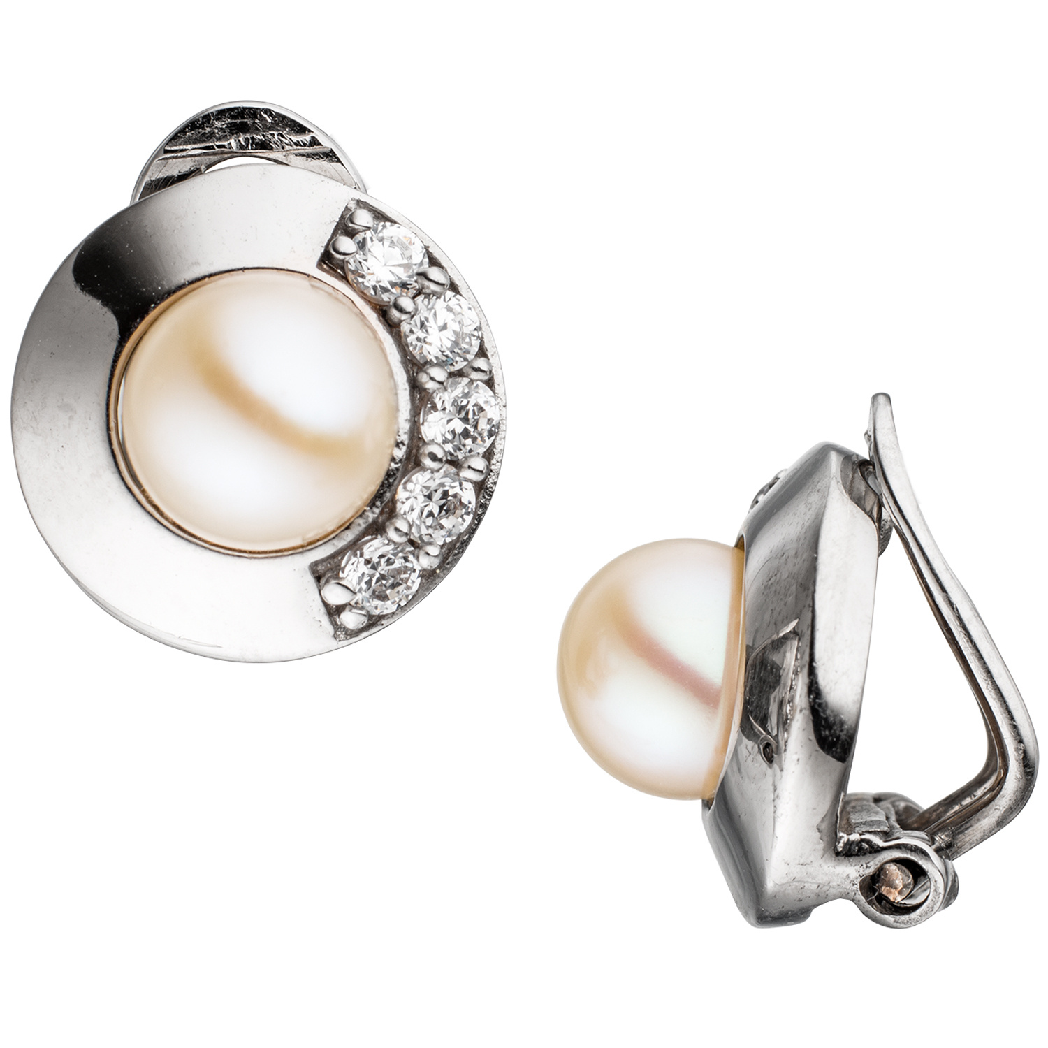 1 Paar Ohrclips aus 925 Sterlingsilber, rhodiniert, mit 2 weißen Süßwasser-Zuchtperlen und 10 Zirkonia, Durchmesser ca. 13 mm, Gewicht ca. 5,2 g * Der Artikel ist anlaufgeschützt (rhodiniert) * Bitte beachten Sie die Maße! Auf dem Foto kann der Artikel größer wirken *