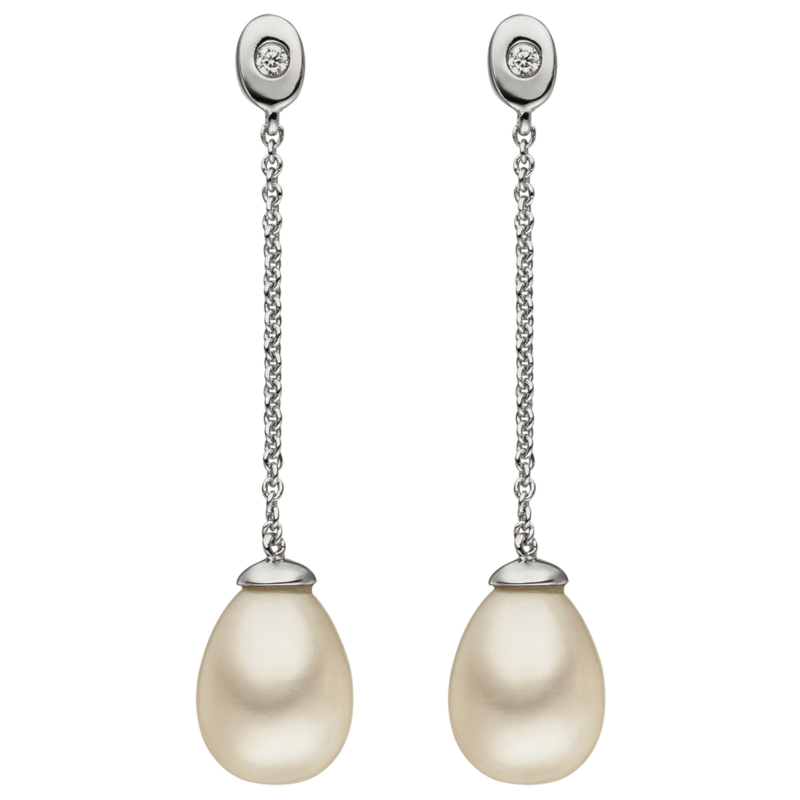 1 Paar Ohrhänger aus 925 Sterlingsilber, rhodiniert, mit 2 Süßwasser-Zuchtperlen und 2 Zirkonia, Höhe ca. 38,1 mm, Breite ca. 7,8 mm, Gewicht ca. 3,2 g * Der Artikel ist anlaufgeschützt (rhodiniert) * Bitte beachten Sie die Maße! Auf dem Foto kann der Artikel größer wirken *