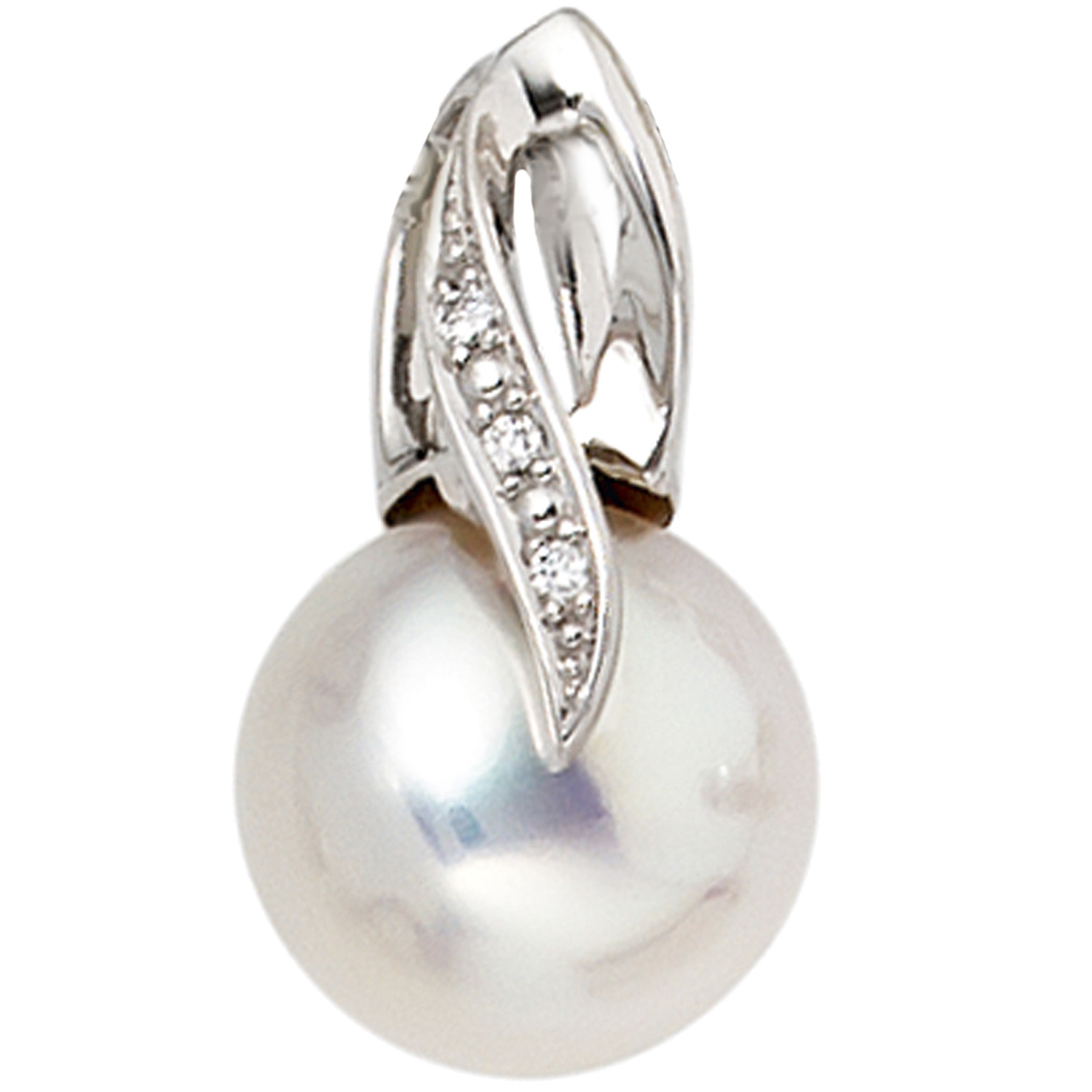 Anhänger ohne Kette aus 14 Karat (585) Weißgold mit einer Süßwasser-Zuchtperle und 3 Diamant-Brillanten, 0,01 ct., W/SI wesselton (weiß), SI=(kleine, mit bloßem Auge nicht erkennbare natürliche Einschlüsse), Feinbearbeitung gut, Höhe ca. 18 mm, Breite ca. 10,2 mm, Tiefe ca. 7,6 mm, Innenmaße der Öse ca. 5,3 mm x 3,2 mm, Gewicht ca. 2,0 g * Bitte beachten Sie die Maße! Auf dem Foto kann der Artikel größer wirken *