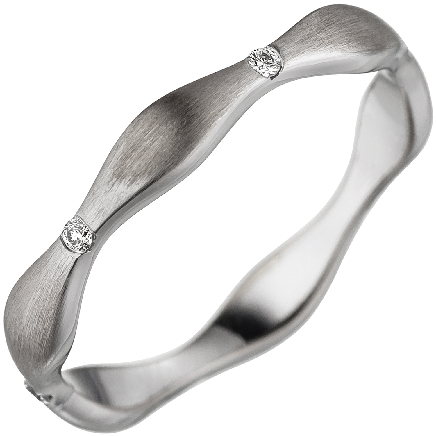 Damenring "Welle" aus 14 Karat (585) Weißgold, mattiert, mit 6 Diamant-Brillanten, 0,06 ct., W/SI wesselton (weiß), SI=(kleine, mit bloßem Auge nicht erkennbare natürliche Einschlüsse), Feinbearbeitung gut, Breite ca. 3 mm, Tiefe ca. 1,8 mm, Gewicht ca. 2,5 g * Bitte beachten Sie die Maße! Auf dem Foto kann der Artikel größer wirken *