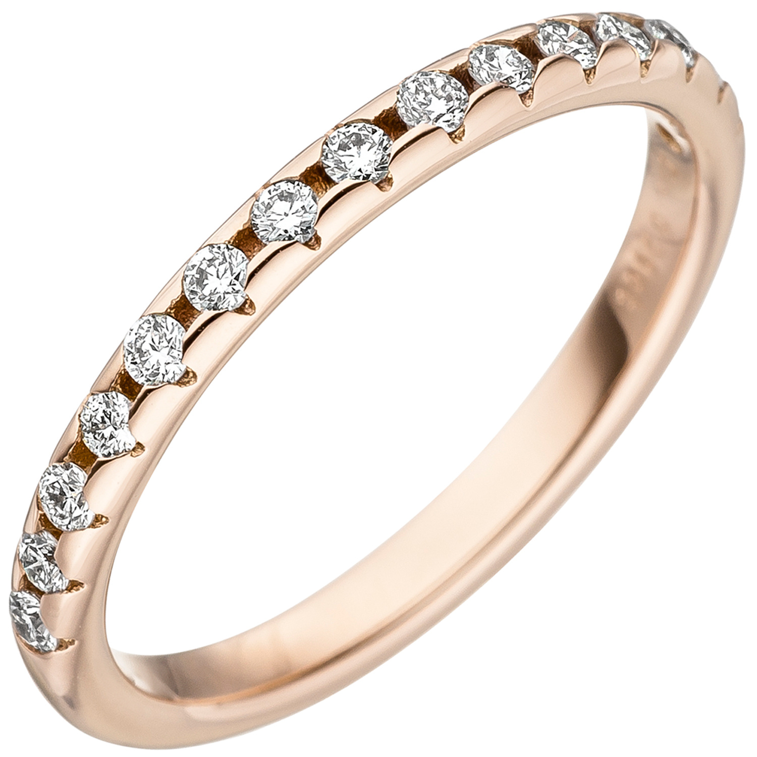 Damenring aus 14 Karat (585) Rotgold mit 15 Diamant-Brillanten, 0,29 ct., W/SI wesselton (weiß), SI=(kleine, mit bloßem Auge nicht erkennbare natürliche Einschlüsse), Feinbearbeitung gut, Breite ca. 2,4 mm, Tiefe ca. 1,8 mm, Gewicht ca. 2,5 g * Bitte beachten Sie die Maße! Auf dem Foto kann der Artikel größer wirken *