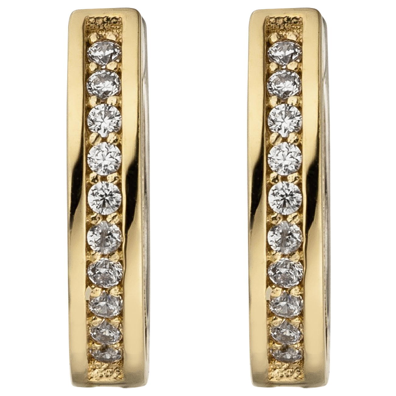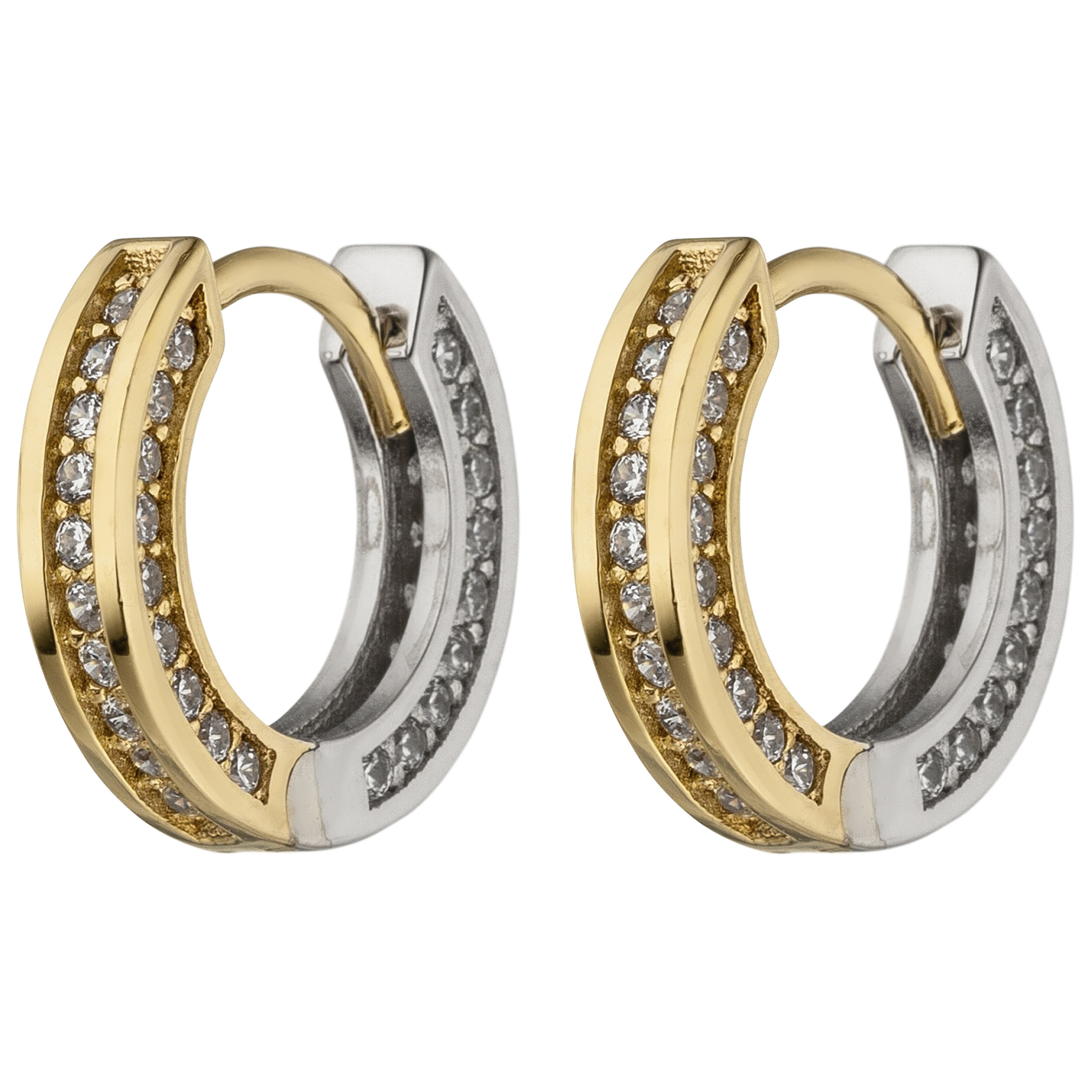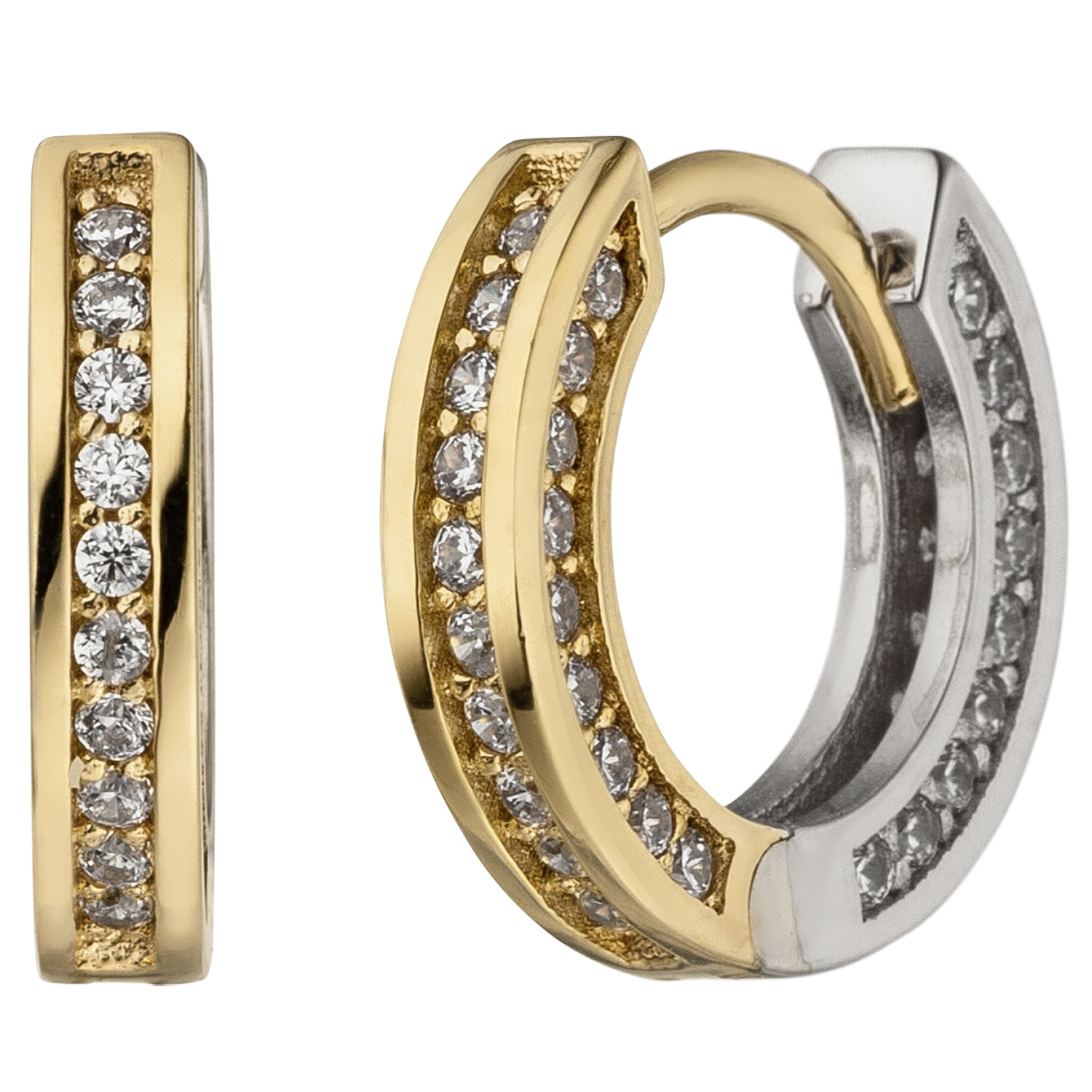 1 Paar Creolen mit Klappmechanik aus 8 Karat (333) Gold, Gelbgold mit Weißgold kombiniert, mit 56 Zirkonia, Außendurchmesser ca. 15,5 mm, Breite ca. 2,5 mm, Gewicht ca. 2,7 g * Bitte beachten Sie die Maße! Auf dem Foto kann der Artikel größer wirken *