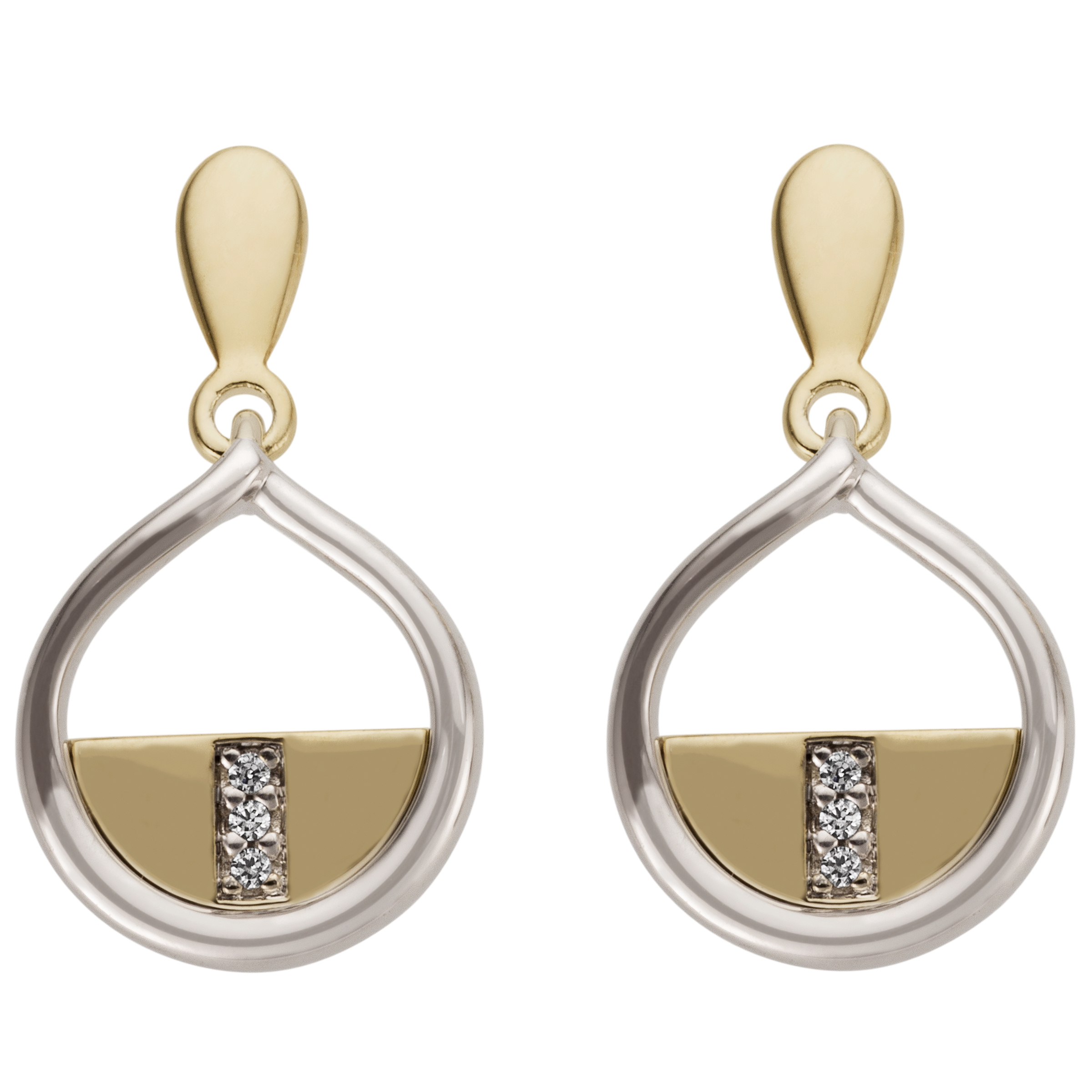 1 Paar Ohrhänger aus 14 Karat (585) Gold, Weißgold mit Gelbgold kombiniert, mit 6 Diamant-Brillanten, 0,02 ct., W/SI wesselton (weiß), SI=(kleine, mit bloßem Auge nicht erkennbare natürliche Einschlüsse), Feinbearbeitung gut, Höhe ca. 17,8 mm, Breite ca. 10 mm, Gewicht ca. 2,2 g * Bitte beachten Sie die Maße! Auf dem Foto kann der Artikel größer wirken *