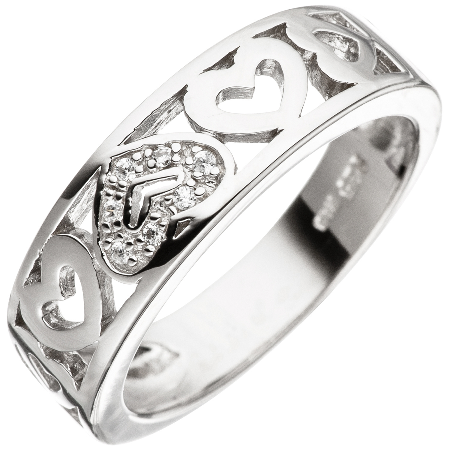 Damenring "Herzen" aus 925 Sterlingsilber, rhodiniert, teilmattiert, mit 7 Zirkonia, Breite ca. 6,1 mm, Tiefe ca. 2,5 mm, Gewicht ca. 3,5 g * Der Artikel ist anlaufgeschützt (rhodiniert) * Bitte beachten Sie die Maße! Auf dem Foto kann der Artikel größer wirken *