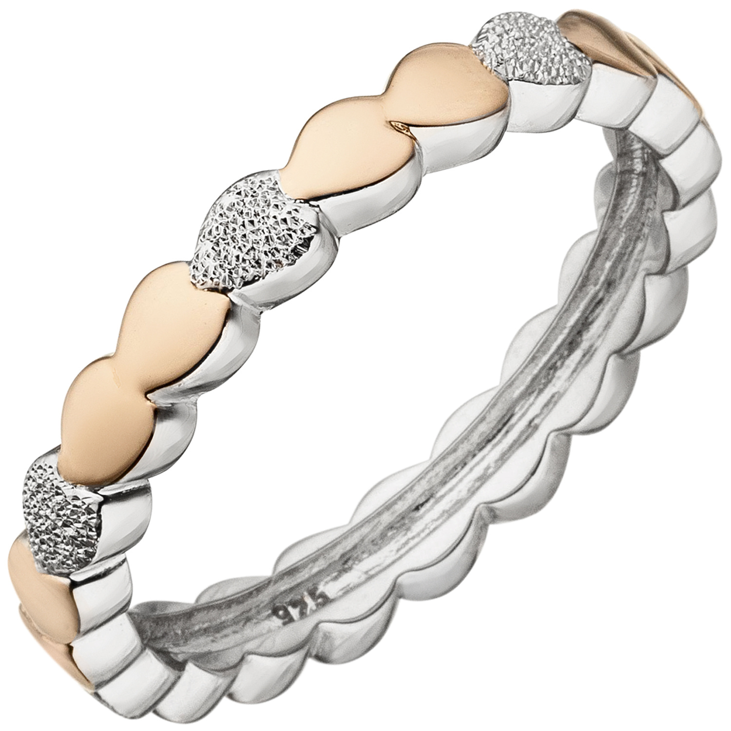 Damenring "Herzen" aus 925 Sterlingsilber, rhodiniert und teilrotvergoldet, mit Glitzereffekt, Breite ca. 3,3 mm, Tiefe ca. 2,1 mm, Gewicht ca. 2,7 g * Der Artikel ist anlaufgeschützt (rhodiniert) * Bitte beachten Sie die Maße! Auf dem Foto kann der Artikel größer wirken *