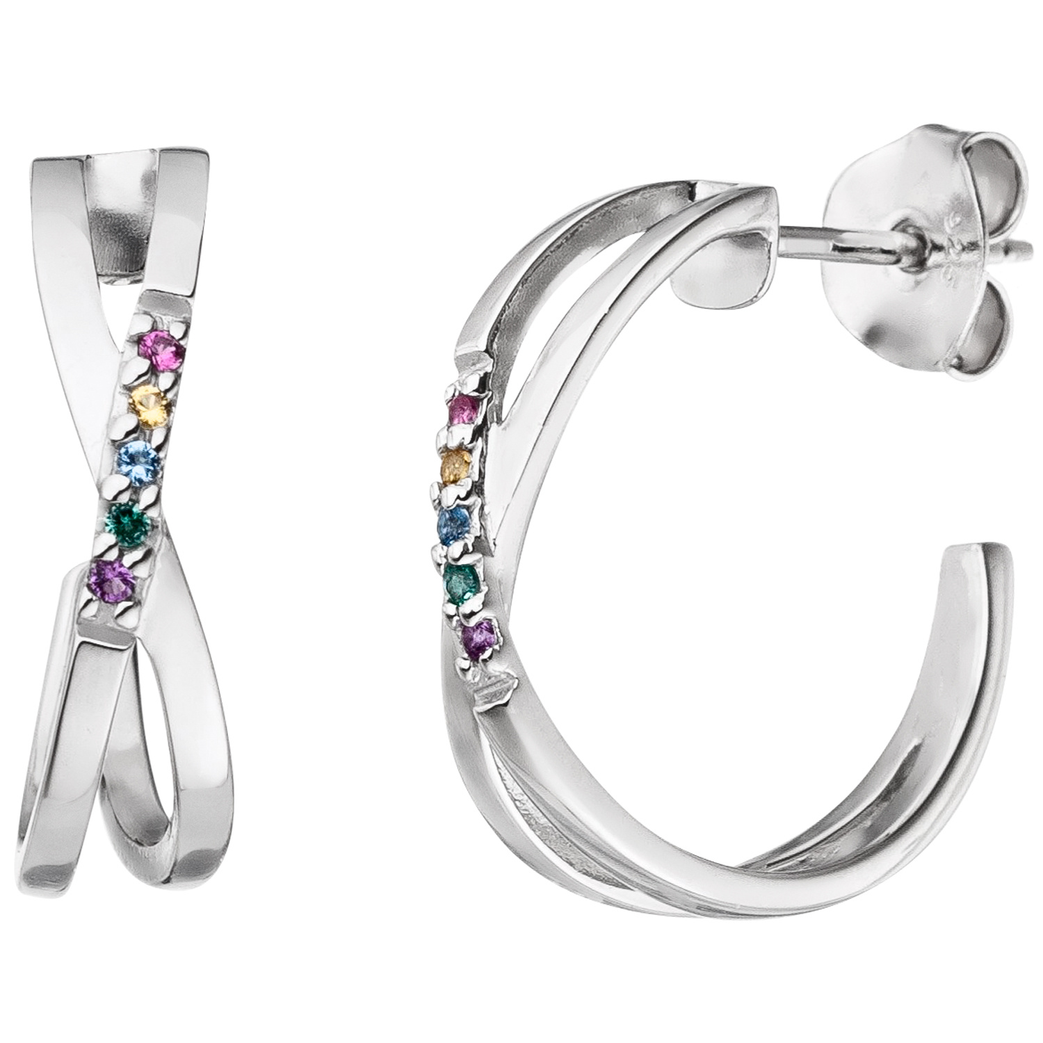 1 Paar Halbcreolen aus 925 Sterlingsilber, rhodiniert, mit 10 bunten Zirkonia, Höhe ca. 18,3 mm, Breite ca. 5,1 mm, Gewicht ca. 3,0 g * Der Artikel ist anlaufgeschützt (rhodiniert) * Bitte beachten Sie die Maße! Auf dem Foto kann der Artikel größer wirken *