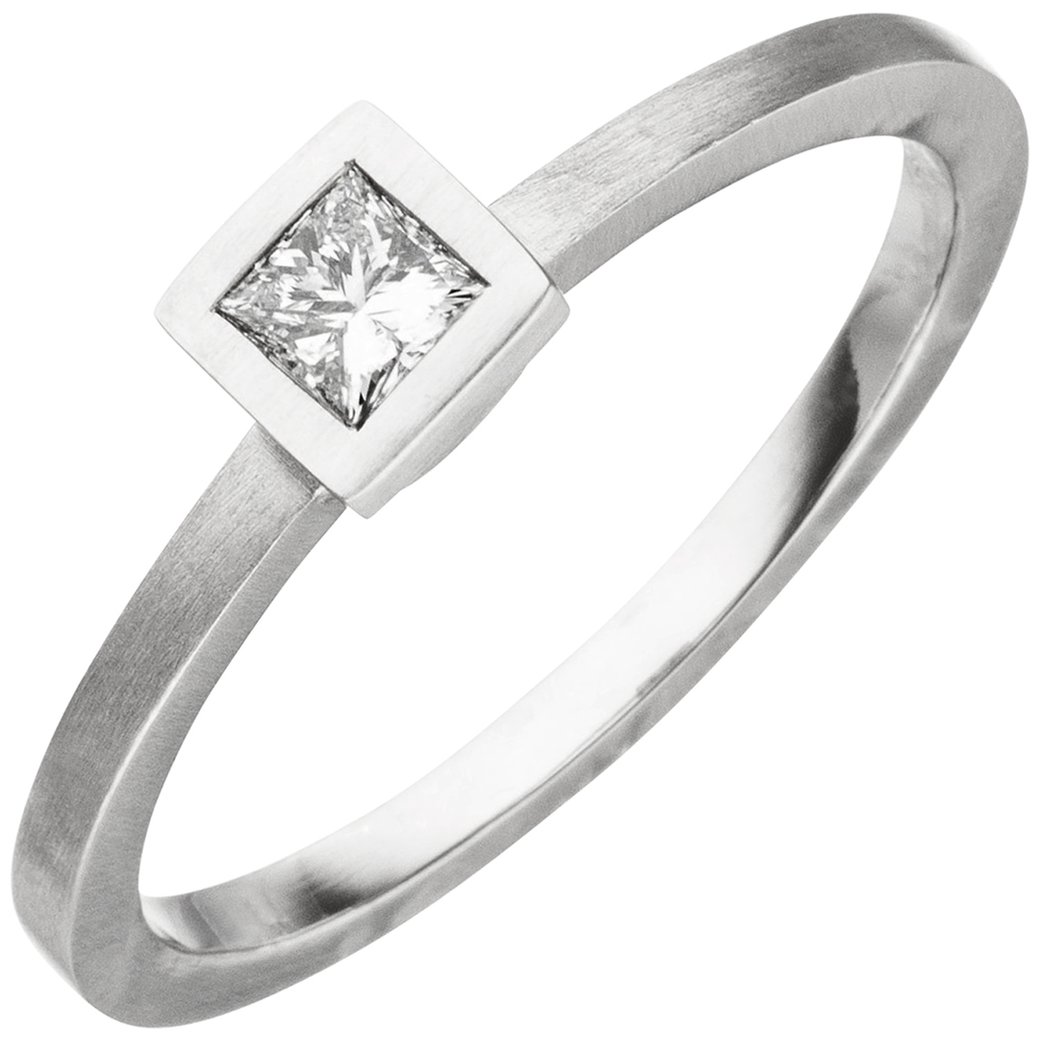 Damenring aus 950 Platin, teilmattiert, mit einem Diamanten im Princess-Schliff, 0,20 ct., W/SI wesselton (weiß), SI=(kleine, mit bloßem Auge nicht erkennbare natürliche Einschlüsse), Breite ca. 4,7 mm, Tiefe ca. 5,1 mm, Gewicht ca. 3,4 g * Bitte beachten Sie die Maße! Auf dem Foto kann der Artikel größer wirken *