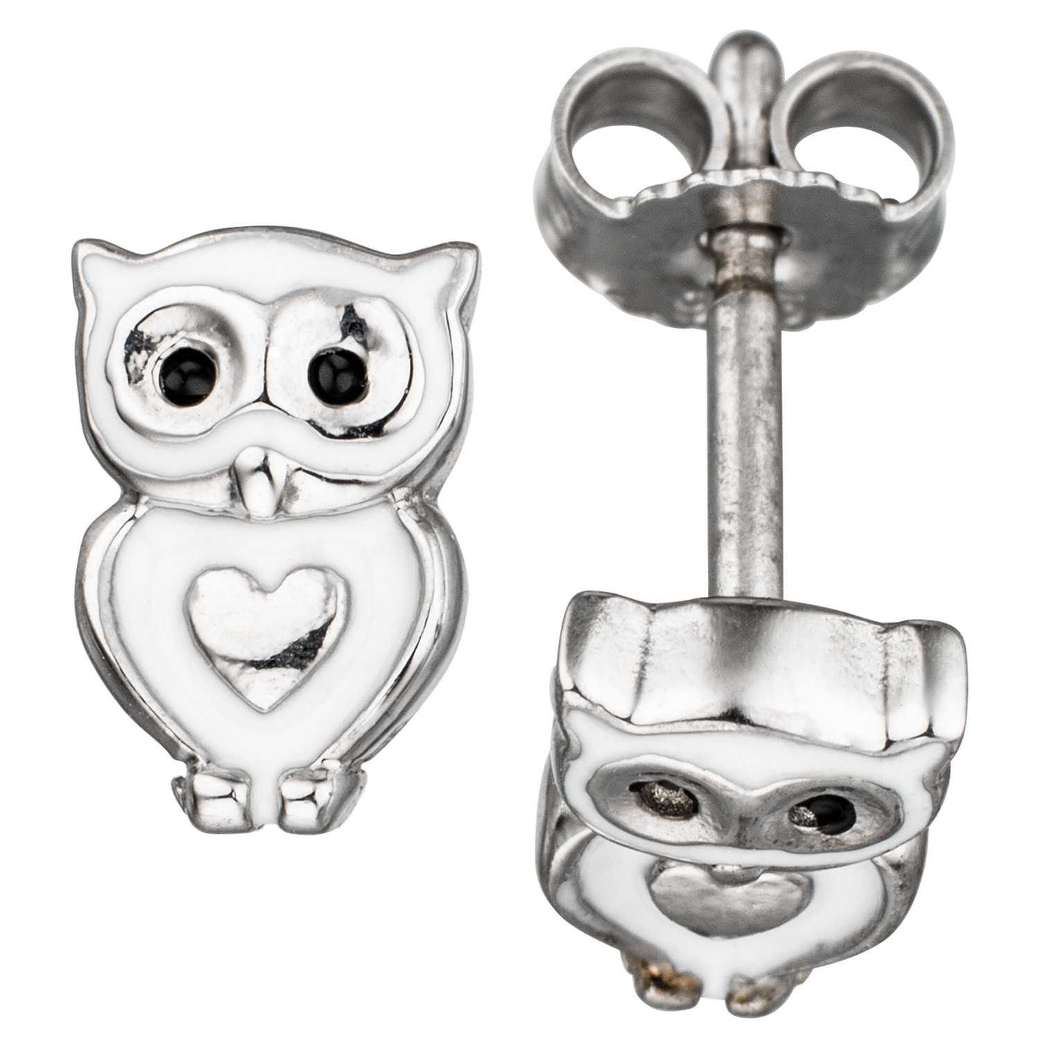 1 Paar Kinder-Ohrstecker "Eule" aus 925 Sterlingsilber, rhodiniert, mit weiß-schwarzer Lackeinlage, Höhe ca. 7,7 mm, Breite ca. 5,2 mm, Gewicht ca. 1,0 g * Der Artikel ist anlaufgeschützt (rhodiniert) * Bitte beachten Sie die Maße! Auf dem Foto kann der Artikel größer wirken *