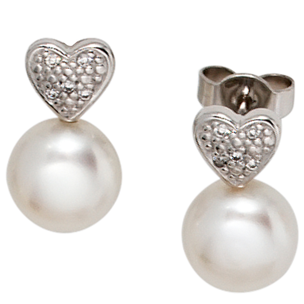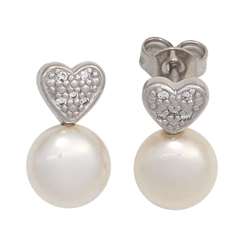 Ohrstecker Herz 585 Gold Weißgold 2 Süßwasser Perlen 10 Diamanten Ohrringe