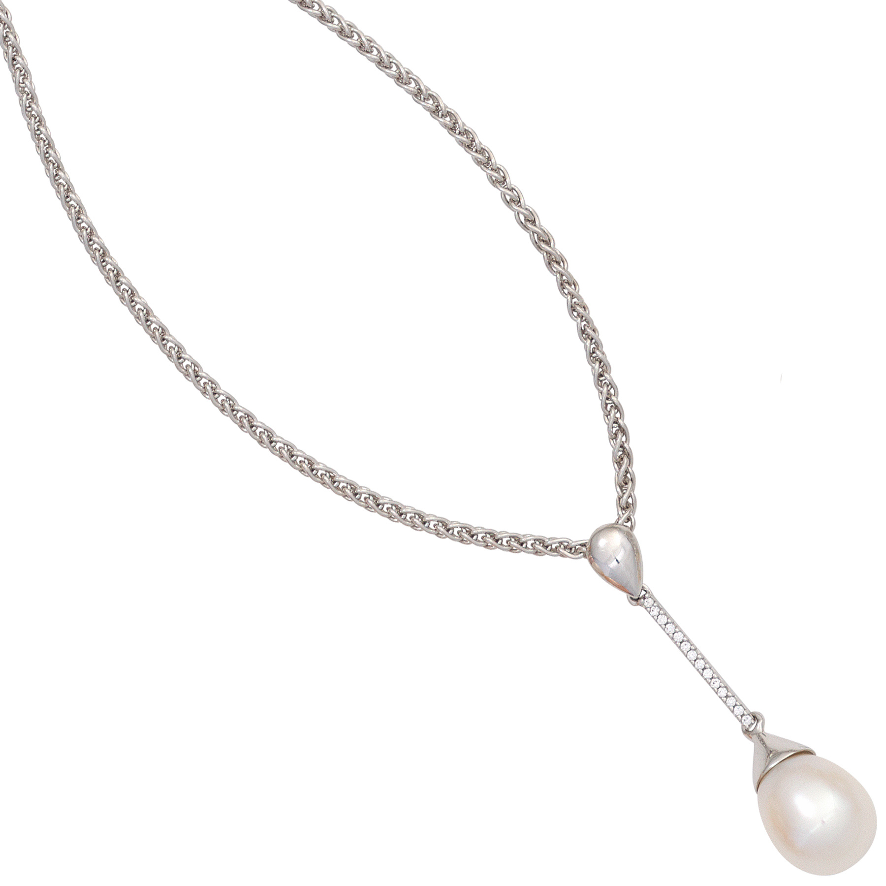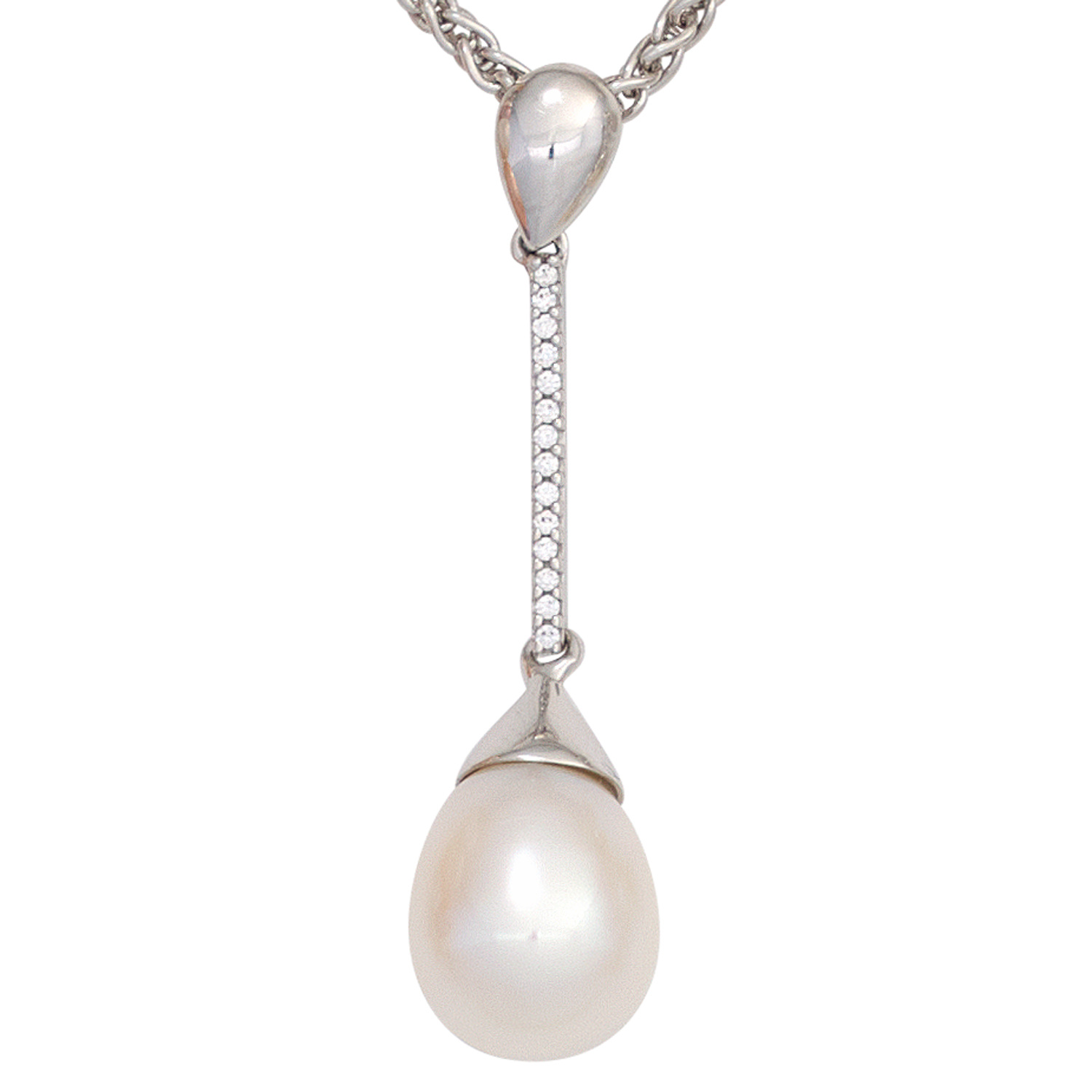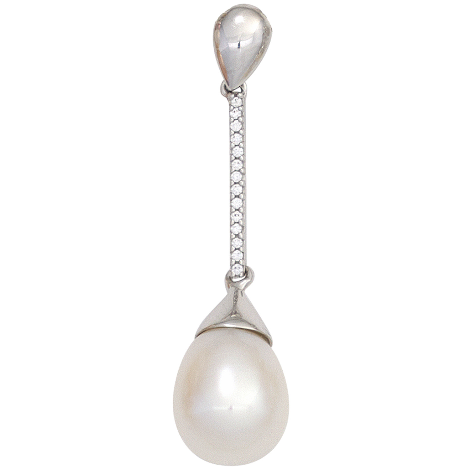 Anhänger aus 14 Karat (585) Weißgold mit einer Süßwasser-Zuchtperle und 14 Diamanten, 0,06 ct., W/SI wesselton (weiß), SI=(kleine, mit bloßem Auge nicht erkennbare natürliche Einschlüsse), Höhe ca. 38,6 mm, Breite ca. 9,4 mm, Tiefe ca. 2,3 mm, Innenmaße der Öse ca. 5 mm x 2,3 mm, Gewicht ca. 2,6 g * Bitte beachten Sie die Maße! Auf dem Foto kann der Artikel größer wirken *