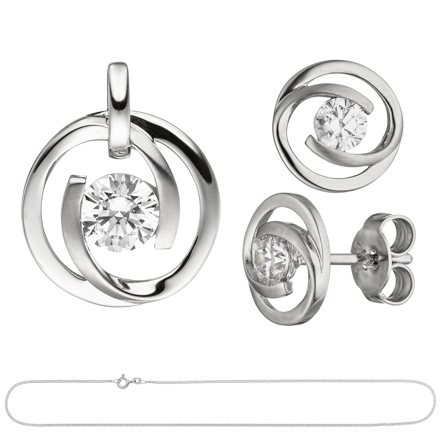 Schmuck-Set, bestehend aus: Anhänger aus 8 Karat (333) Weißgold, teilmattiert, mit einem Zirkonia, Höhe ca. 16,3 mm, Breite ca. 13,1 mm, Tiefe ca. 3,4 mm, Innenmaße der Öse ca. 3,2 mm x 2,9 mm, Gewicht ca. 1,3 g * 1 Paar Ohrstecker aus 8 Karat (333) Weißgold, teilmattiert, mit 2 Zirkonia, Durchmesser ca. 9,3 mm, Gewicht ca. 1,5 g * Panzerkette aus 8 Karat (333) Weißgold mit Federringverschluss, Länge ca. 42 cm, Kettenstärke ca. 1,3 mm x 0,7 mm, Gewicht ca. 2,5 g * Bitte beachten Sie die Maße! Auf dem Foto können die Artikel größer wirken *