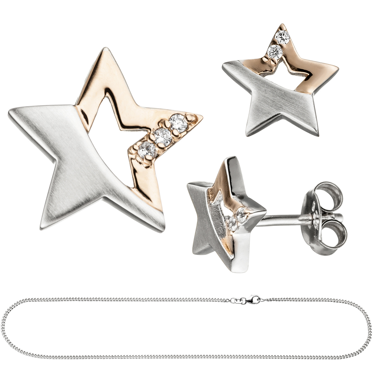 Schmuck-Set, bestehend aus: Anhänger "Stern" aus 925 Sterlingsilber, rhodiniert, teilmattiert und teilrotvergoldet, mit Zirkonia, Höhe ca. 15 mm, Breite ca. 15,8 mm, Tiefe ca. 3,2 mm, Innenmaße der Öse ca. 2,4 mm x 2 mm, Gewicht ca. 1,9 g * 1 Paar Ohrstecker "Stern" aus 925 Sterlingsilber, rhodiniert, teilmattiert und teilrotvergoldet, mit 4 Zirkonia, Höhe ca. 9,2 mm, Breite ca. 10 mm, Gewicht ca. 1,4 g * Panzerkette aus 925 Sterlingsilber, rhodiniert, mit Karabinerverschluss, Länge ca. 42 cm, Kettenstärke ca. 1,7 mm x 0,8 mm, Gewicht ca. 3,3 g * Bitte beachten Sie die Maße! Auf dem Foto können die Artikel größer wirken *