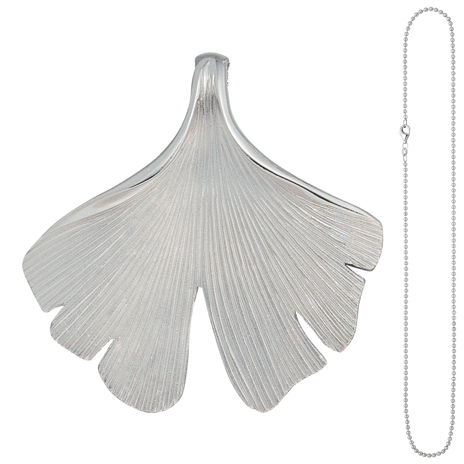 Schmuck-Set, bestehend aus: Anhänger "Ginko" aus 925 Sterlingsilber, teilmattiert, in Handarbeit gefertigt, Höhe ca. 44,6 mm, Breite ca. 43,8 mm, Tiefe ca. 1,3 mm, Innenmaße der Öse ca. 7,6 mm x 4,2 mm, Gewicht ca. 10,5 g * Kugelkette aus 925 Sterlingsilber, rhodiniert, mit Karabinerverschluss, Länge ca. 45 cm, Kettenstärke ca. 2 mm x 2 mm, Gewicht ca. 5,3 g * Bitte beachten Sie die Maße! Auf dem Foto können die Artikel größer wirken *
